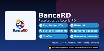BancaRD Lotería RD is een informatieve app voor Android die gebruikers real-time resultaten van de Dominicaanse loterij biedt. Met toegang tot populaire loterijen zoals de Lotería Nacional en LEIDSA, kunnen gebruikers de nieuwste resultaten en trends volgen. De app biedt ook een functie voor het bekijken van 'hete nummers', waardoor spelers beter geïnformeerd zijn over hun keuzes. Daarnaast kunnen gebruikers hun favoriete loterijen instellen voor meldingen en alerts, zodat ze altijd op de hoogte blijven van de laatste uitslagen.